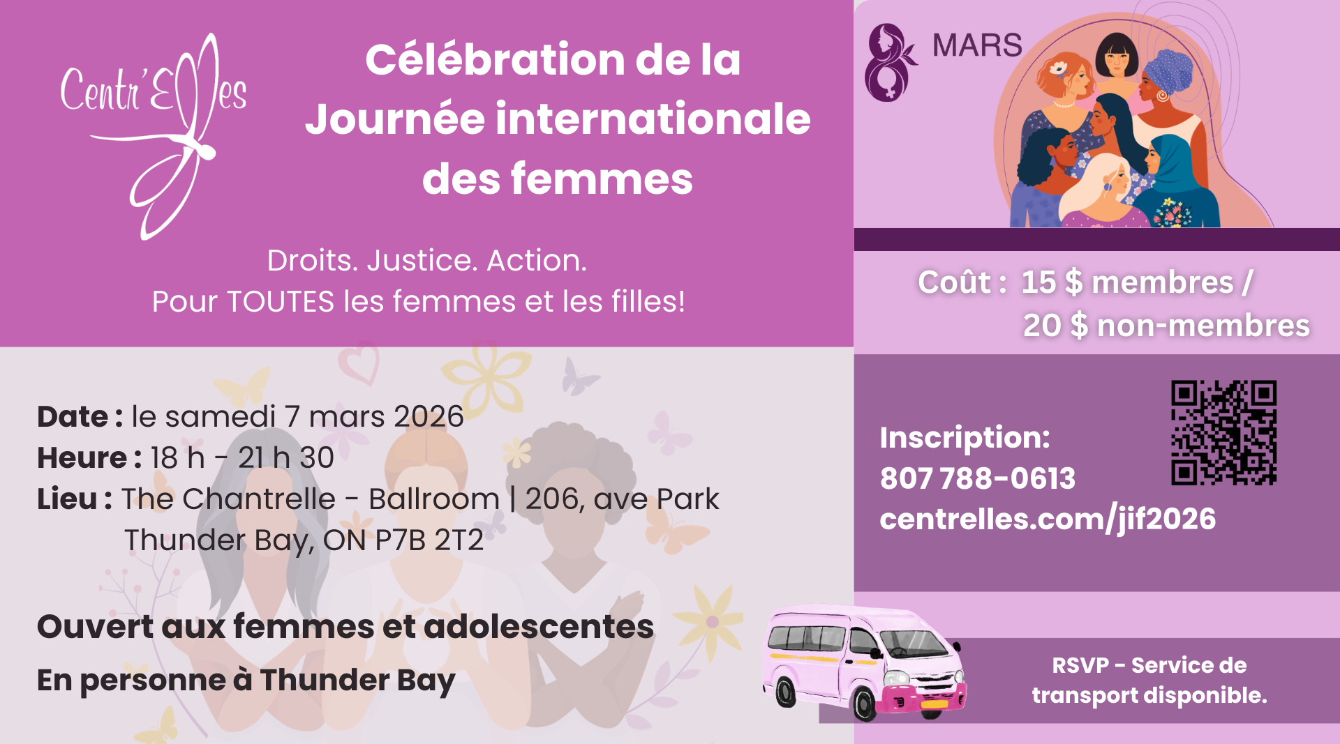 À l’occasion de la Journée internationale des femmes, nous vous invitons à vous joindre à nous le 7 mars 2026 pour célébrer une soirée conviviale et festive !